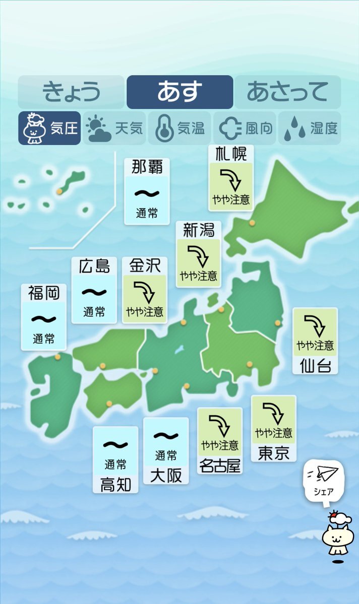 本日31日は全国的に爆弾低気圧らしい。首こり、頭痛、めまい、頭重感、耳鳴りなど気象病が発症しやすいので注意。 なお、姿勢が悪いと体の軸がしっかり定まらず、気圧の変化を受けやすく、特に背骨のS字カーブが失われると、背骨の中を通る自律神経が影響され、気象の変化で症状が現れる。#気象病