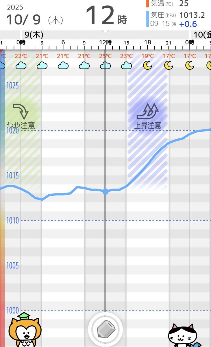 10/9(木)気象病予報 ⚠️気圧安定&寒暖差に注意 台風はまだ近くにありますが、明日は全国的に気圧が安定します。関東では気温が下がり、朝晩も20℃を切る予報です。一方でいまだに30℃を超え寒暖差が10℃以上開く地域もありますので、寝る格好や外出の服装に気をつけましょう。 #寒暖差疲労 pic.x.com/KuXS4o54os