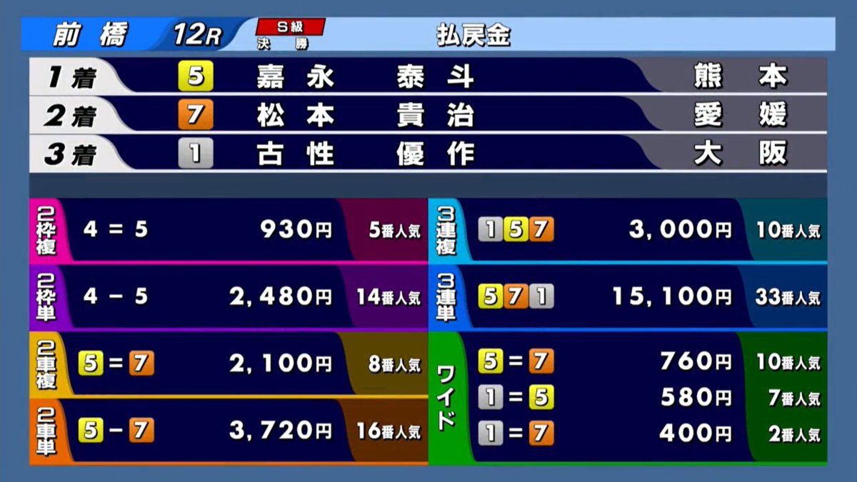10/26 #前橋競輪 GⅠ 第12レース 5番車 #嘉永泰斗 選手が1着になりました! 優勝おめでとうございます🥳 #サテライト宇土 #寛仁親王牌・世界選手権記念 pic.x.com/TQ3biIPNjg