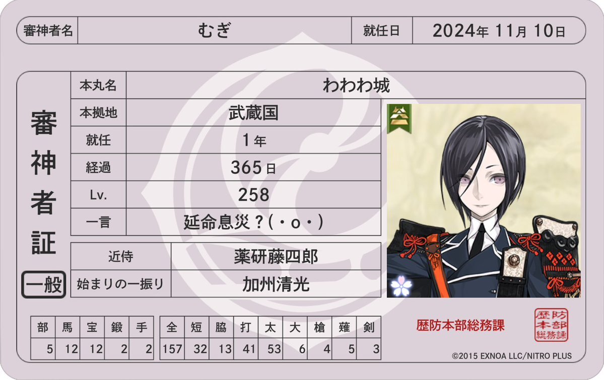 鍛刀でお迎えした時の台詞が「苦しみは無くならない、命が絶えるその日まで……。」 #審神者さんと繋がりたい x.com/asagiri_byakuu…