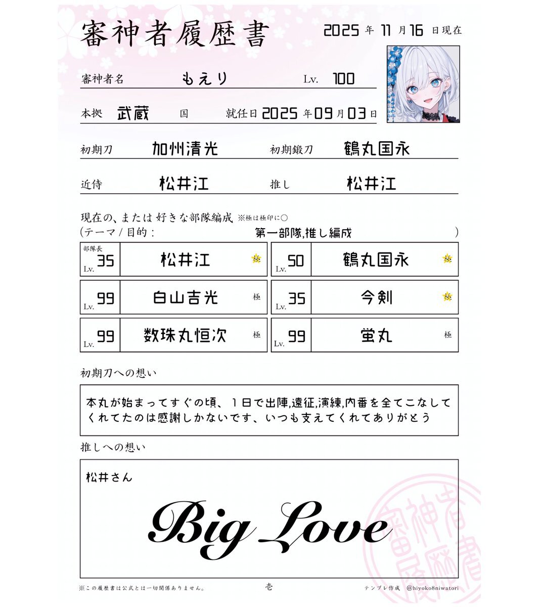 #審神者さんと繋がりたい #審神者履歴書 夢腐あり、同担歓迎です.ᐟ.ᐟ 絵を描いたり編み物したりもします。 ゆったり絡める方募集してます✨️ ♡していただければ飛んでお迎えにあがります♫ pic.x.com/lNxw6HWq1q