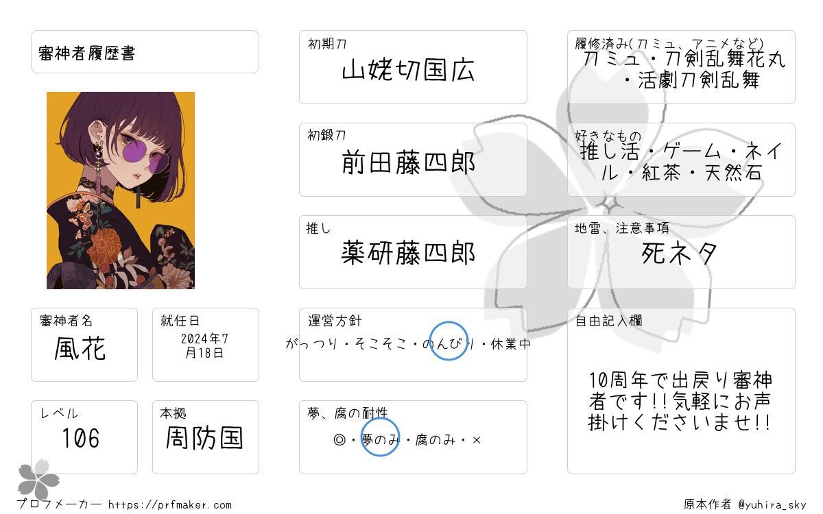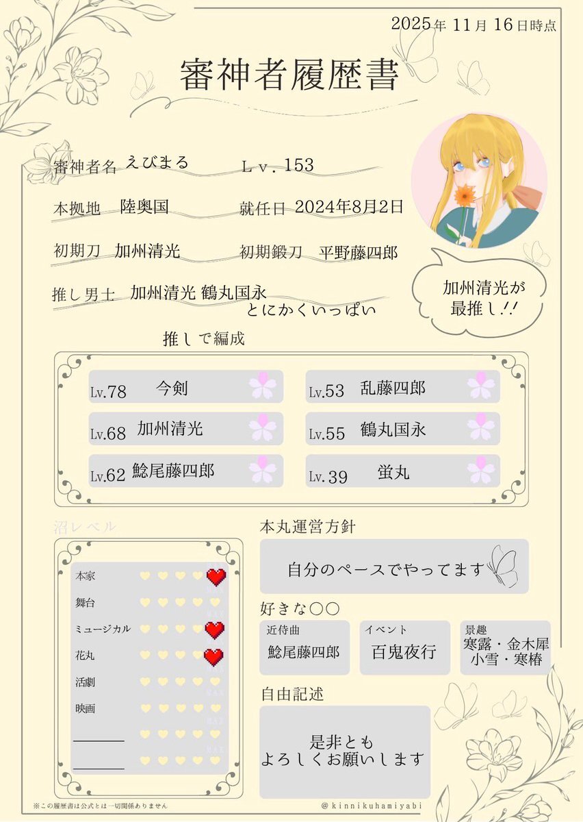 審神者仲間、求む✨️✨️✨️ 関東/成人 本家もメディミも等しく好き☺️ 全反応にてプロフィール等にお邪魔します🙇♀️ よろしくどうぞ🌸 (履歴書の見解は自本丸です) #刀剣乱舞好きさんと繋がりたい #審神者さんと繋がりたい #審神者履歴書 pic.x.com/kf8mKKY1bS