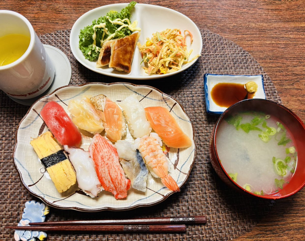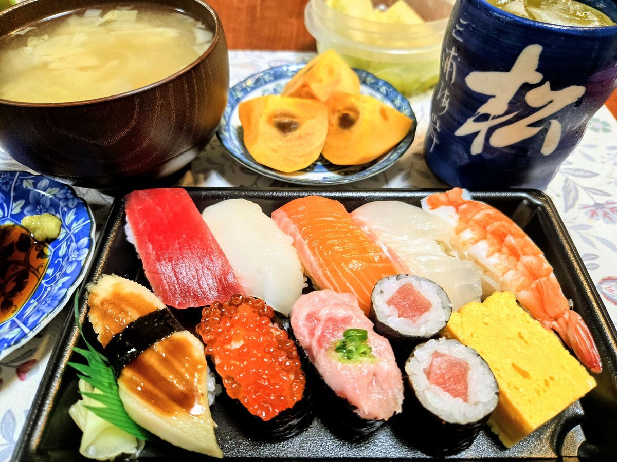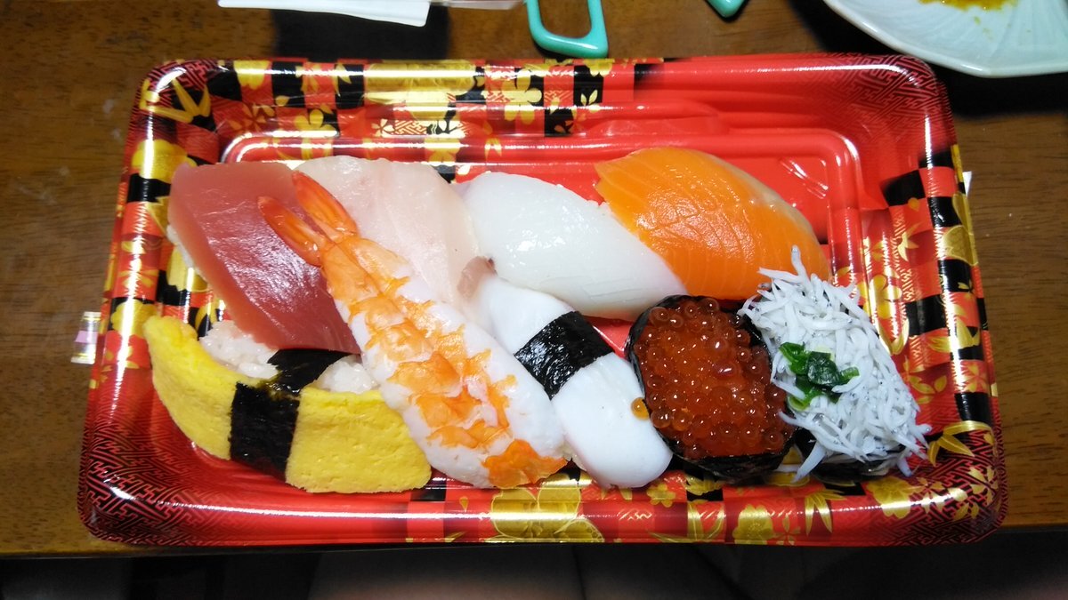 お赤飯炊きましょう! それともお寿司食べに行きますか? お祝いのケーキを焼きましょう! それともお寿司食べに行きますか? #魔王2099 そして寿司の日と言う事でスシ。お昼にお寿司食べて来ました。 #寿司の日