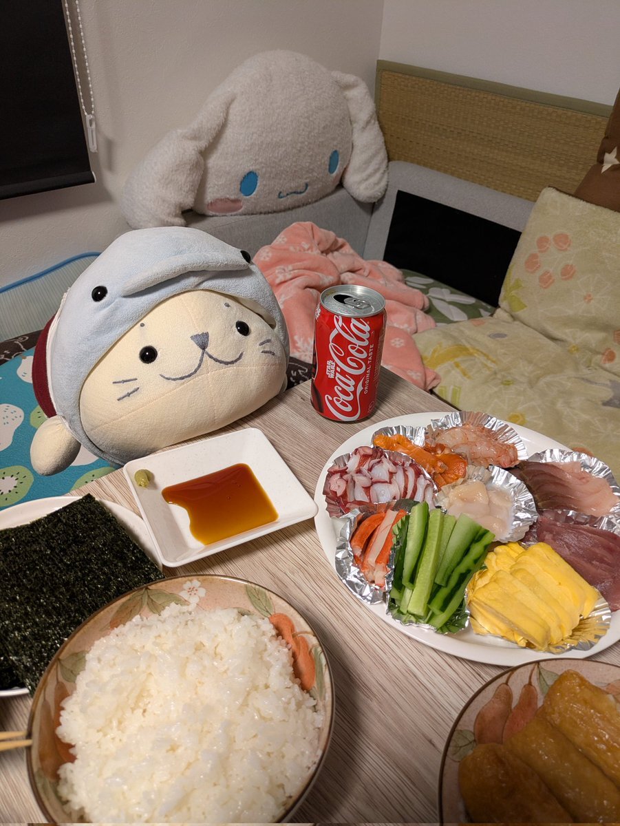 今日お寿司の日。手巻き寿司。寿司パーティー🍣 #しろたん #ぬいぐるみ #寿司の日 pic.x.com/EVTaWeFSJt
