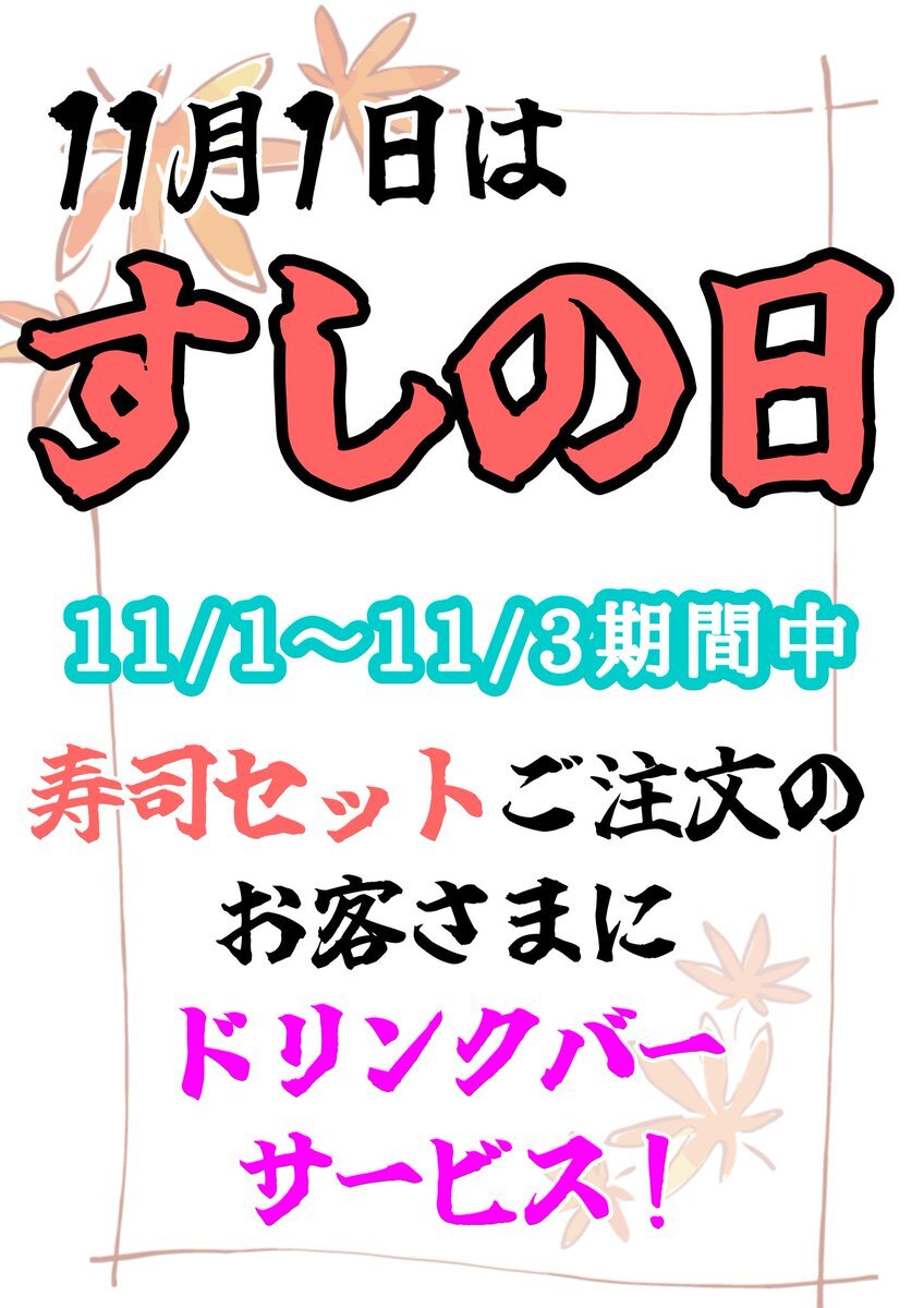 \寿司の日/ 11/1は全国寿司の日🍣(°▽°)✨ 山留カワトク店では11/1~11/3までの連休期間中、当店一番人気メニュー ✨寿司セット お子さまメニュー ✨わらしっこセット ✨おりこう満点丸 ご注文のお客さまにドリンクバーサービス♪ お食事のさいはぜひご利用くださいませ✨ #山留 #山留カワトク店