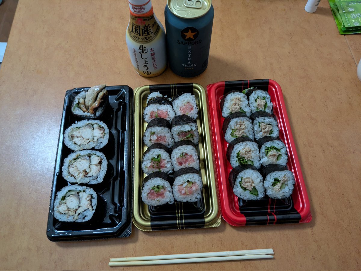 こんばんは🌃 今日は寿司の日という事で、晩飯は巻き寿司パーティー。 鯖の寿司を買ったけど、身が飛び出とるのは嬉しいね(^^) そしてビールが美味い! #晩ごはん #寿司の日 pic.x.com/Hv9ZpDa8ew