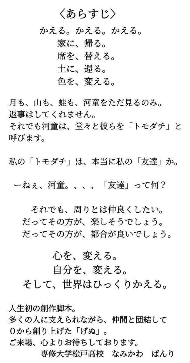 専修大学松戸高校の演劇部のみなさんが創作した、かっぱを題材にした演劇『げぬ』が、演劇の地区大会で優秀賞を獲得しました! 大内かっぱハウスも微力ながら取材協力をさせて頂きました😊 その演劇『げぬ』が11月29日(土)に上演されます! #専松演劇部 #相馬圭弐 #大内かっぱハウス #かっぱ #河童 pic.x.com/m35eu6ir2s