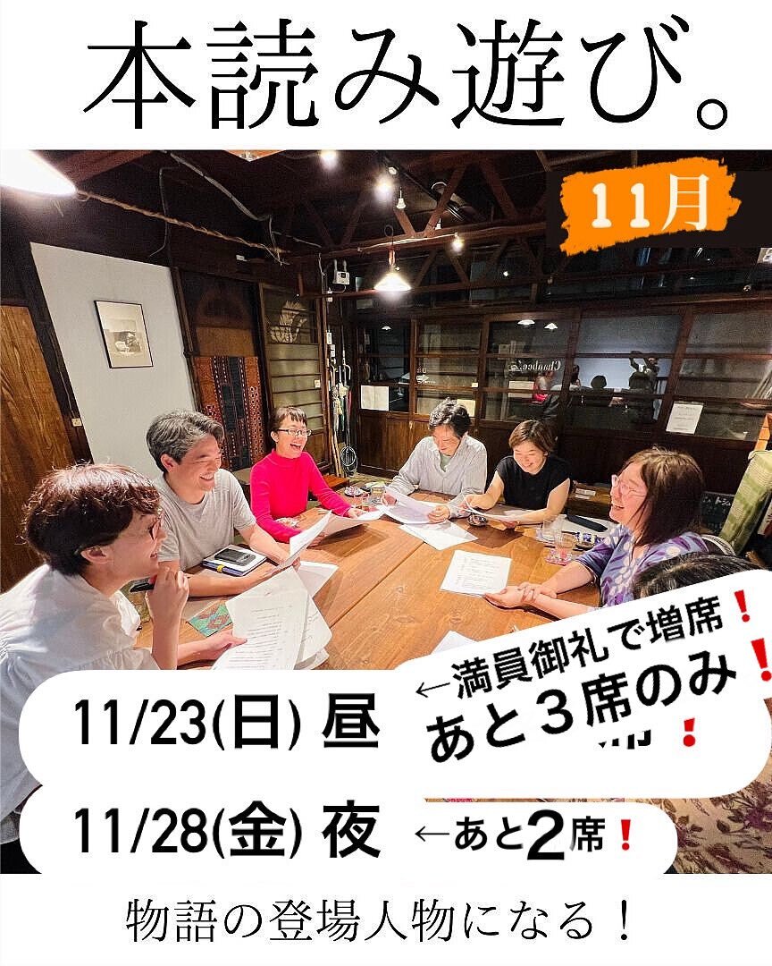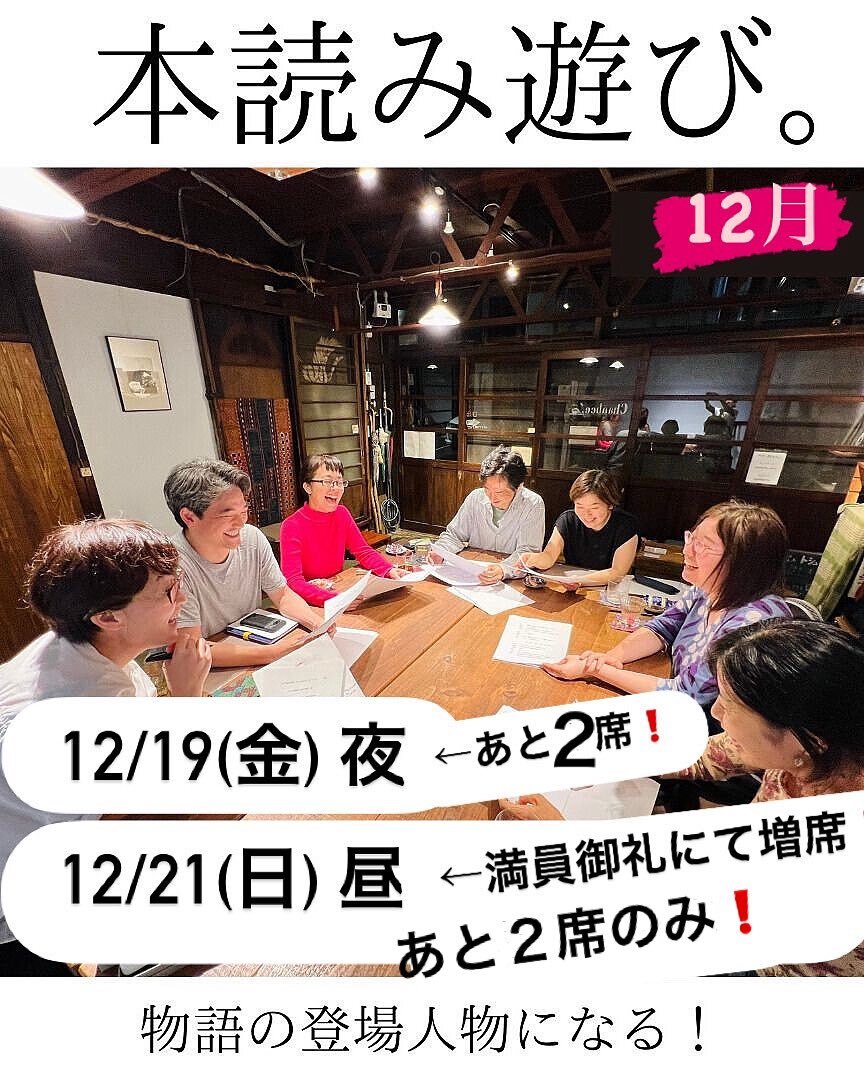 『#本読み遊び。物語の登場人物になる!』 11/23(日) vol.17 満員御礼で増席✨️3席のみ❗️ 11/28(金) vol.18 残2席❗️ 12/19(金) vol.19 残2席❗️ 12/21(日) vol.20 満員御礼で増席✨️2席のみ❗️ お申込み👉️ forms.gle/G8AfLyGyTx64AF… #ワークショップ #演劇 #小劇場 #江東区 #深川 #門前仲町 pic.x.com/fm0fxxZ6T5
