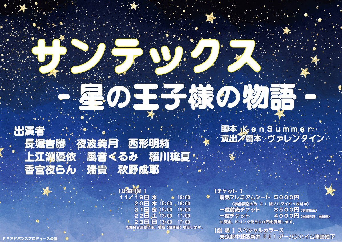 舞台『サンテックス-星の王子の物語』 11/19(水) ◾︎19:00- 20(木) ◾︎15:00- ◾︎19:00- 21(金) ◾︎15:00- ◾︎19:00- 22(土) ◾︎13:00- ◾︎17:00- 23(日) ◾︎13:00- ◾︎17:00- 📍中野スペシャルカラーズ 🎫ご予約▷ quartet-online.net/ticket/hw24qij… #中野 #小劇場 #舞台 #演劇 pic.x.com/tRmwBIBlWw