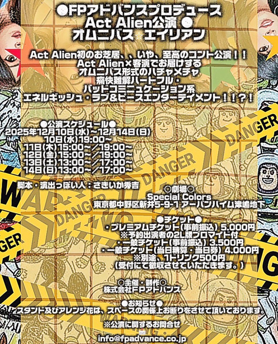 コント公演『オムニバス・エイリアン』 12/10(水) ◾︎19:00- 11(木) ◾︎15:00- ◾︎19:00- 12(金) ◾︎15:00- ◾︎19:00- 🎂お誕生日 13(土) ◾︎13:00- ◾︎17:00- 14(日) ◾︎13:00- ◾︎17:00- 📍中野スペシャルカラーズ 🎫ご予約▷ quartet-online.net/ticket/43oyf5x… #中野 #小劇場 #舞台 #演劇 pic.x.com/RpPm2gX5zn