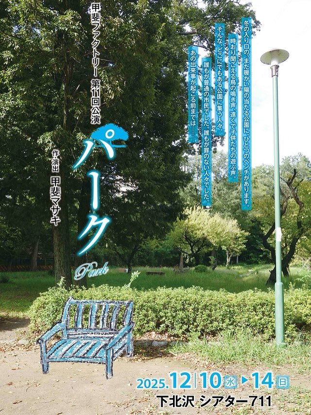 「パーク」のフライヤーが公開されましたので改めてお知らせ!📢 甲斐ファクトリー第11回公演「パーク」 日時:12月10〜14日 場所:下北沢 シアター711 HP⇩ kaifactory.info チケット販売開始しています! ご来場お待ちしております🙌🏻 #甲斐ファクトリー #パーク #シアター711 #小劇場 pic.x.com/uTFuvQICQi