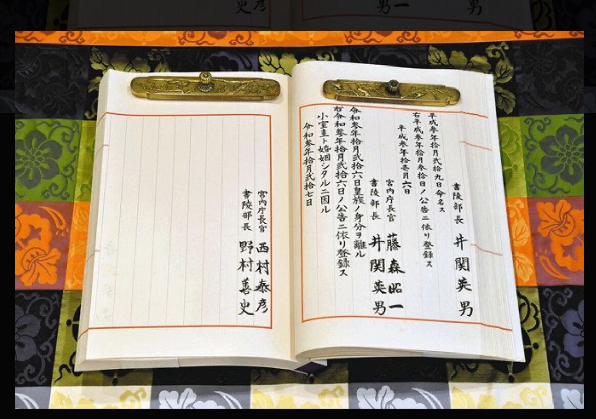 #秋篠宮家に皇統を移してはいけない #小室眞子 もうすぐマコシー誕生日よね? そして小室夫妻の結婚記念日よね? 皇族譜(皇統譜)に『小室圭』の文字。 未来永劫、小室圭氏が日本の皇室に名を残すことになっている現実は未だに辛い。 #竹田恒泰 さえ刻まれていない皇族譜に名を残した #小室圭 。 pic.x.com/o8eQIiO2p2