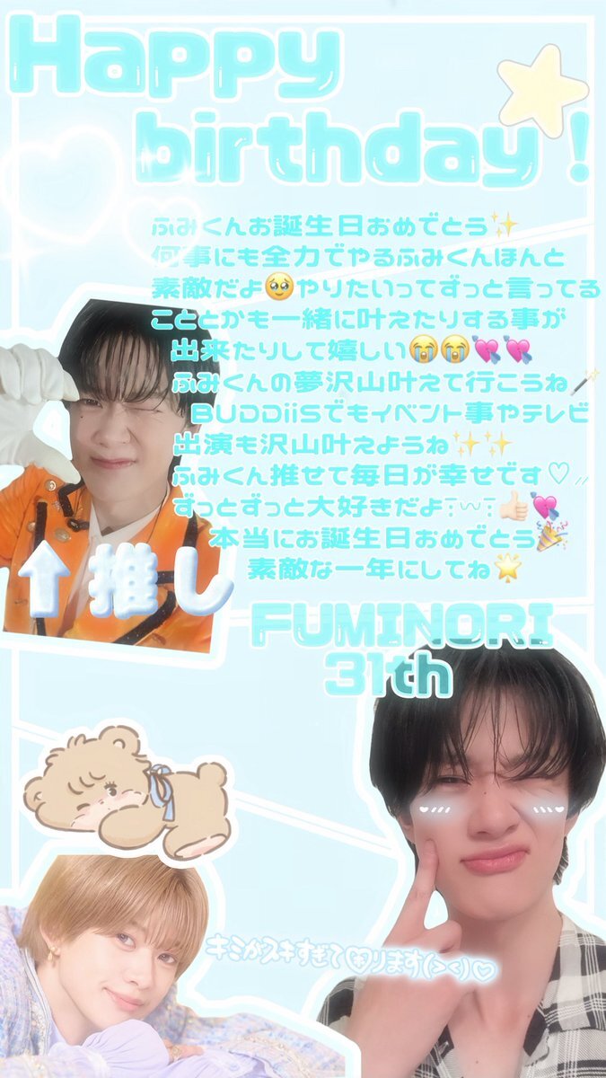 ふみくん誕生日おめでとう! ふみくんのツッコミ強化合宿面白くて大好きです! 奇跡の31歳楽しんでね💕︎ 素敵な1年になりますように🍀.* #BUDDiiS #小川史記 @fuminori_ogawa pic.x.com/rzo5b8El4e