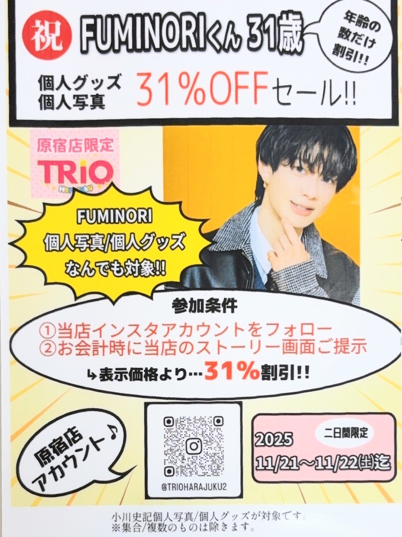 #Happy_FUMINORI_Day お誕生日おめでとうございます🎉 奇跡の31歳をお祝いしてこちら原宿2号店では… 個人グッズ&お写真全品31%OFFセール実施中! 当店インスタ Instagram.com/trioharajuku2 フォロー&お会計時に当店ストーリー画面ご提示で割引対象🎶明日11/22迄、よろしければ是非✨️ #小川史記 #BUDDiiS pic.x.com/jtCQU3UjWh