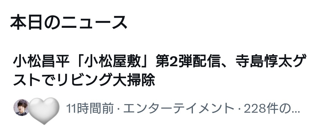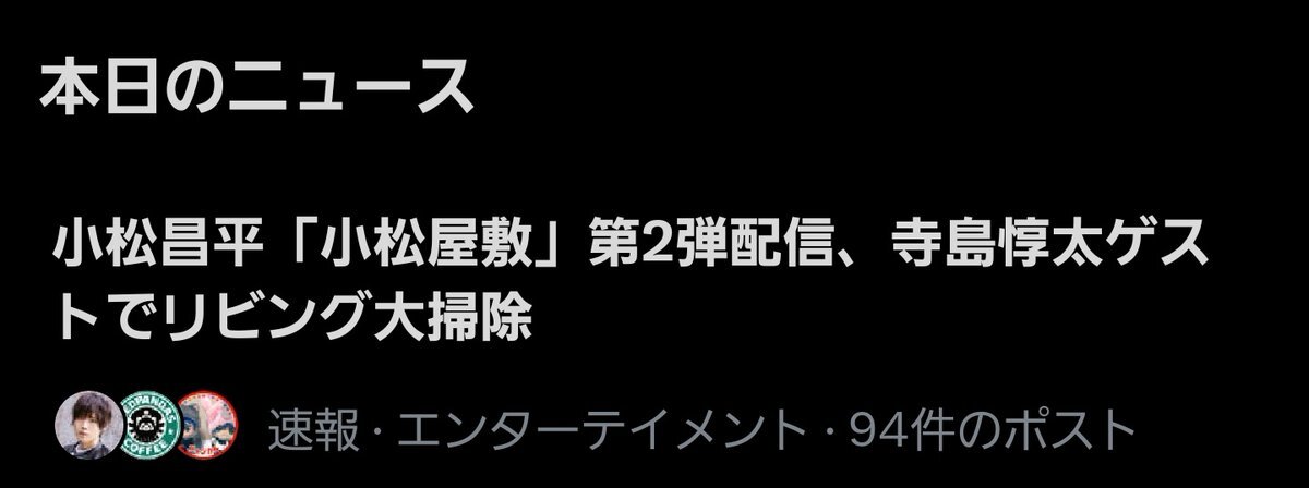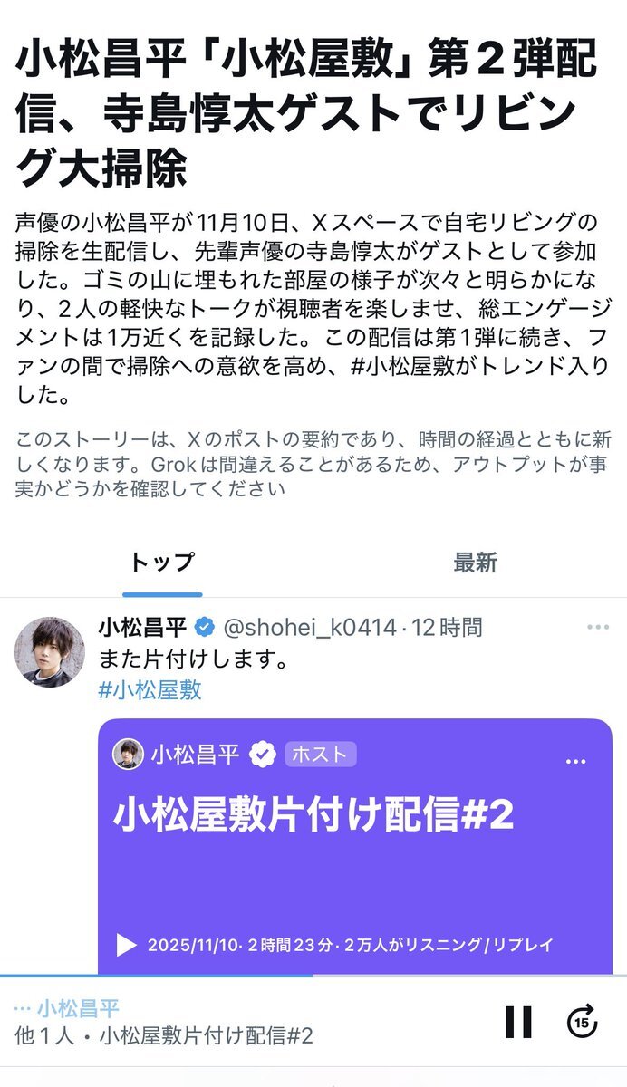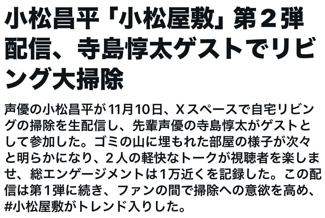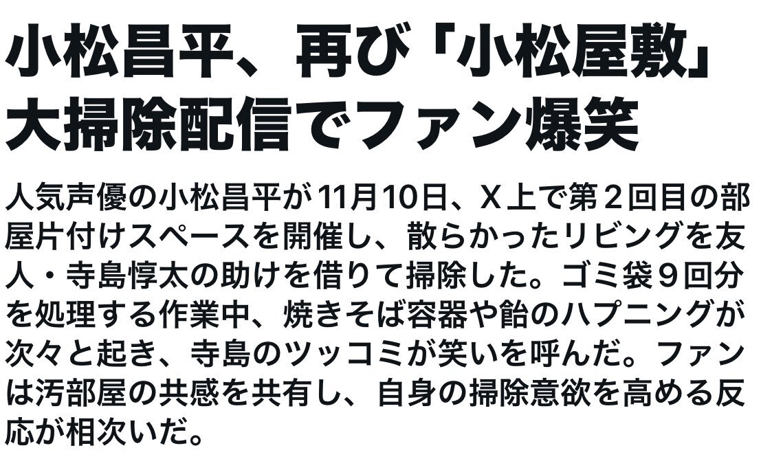 2025年11月10日 ポスト要約 #小松屋敷  人気声優の小松昌平(さん)が11月10日、X上で第2回目の部屋片付けスペースを開催し、散らかったリビングを友人・寺島惇太(さん)の助けを借りて掃除した。 pic.x.com/i9oTOwhUJw