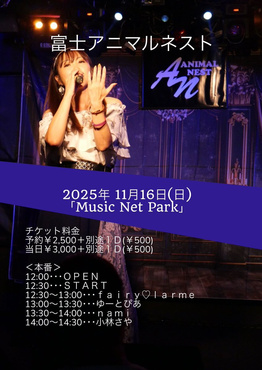 【新着ライブ情報】 ご予約お願いします🙏 11/16(日)Music Net Park 富士ANIMAL NEST 予約¥2,500+別途1D(¥500) 当日¥3,000+別途1D(¥500) 12:00 OPEN 12:30 START 12:30~13:00・・・fairy♡larme 13:00~13:30・・・ゆーとぴあ 13:30~14:00・・・nami 14:00~14:30・・・小林さや