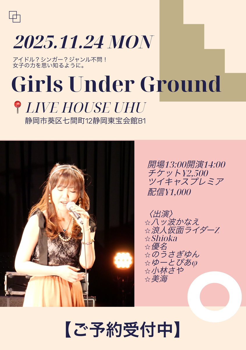 【新着ライブ情報】 ご予約お願いします🙏 11/24(月)ライブハウスUHU 「ガールズアンダーグラウンド」 開場13:00 開演14:00 ¥2,500 ツイキャスプレミア配信 ¥1000 〈出演〉 八ッ波かなえ 浪人仮面ライダーZ Shioka 優名 のうさぎゆん ゆーとぴあφ 小林さや 美海