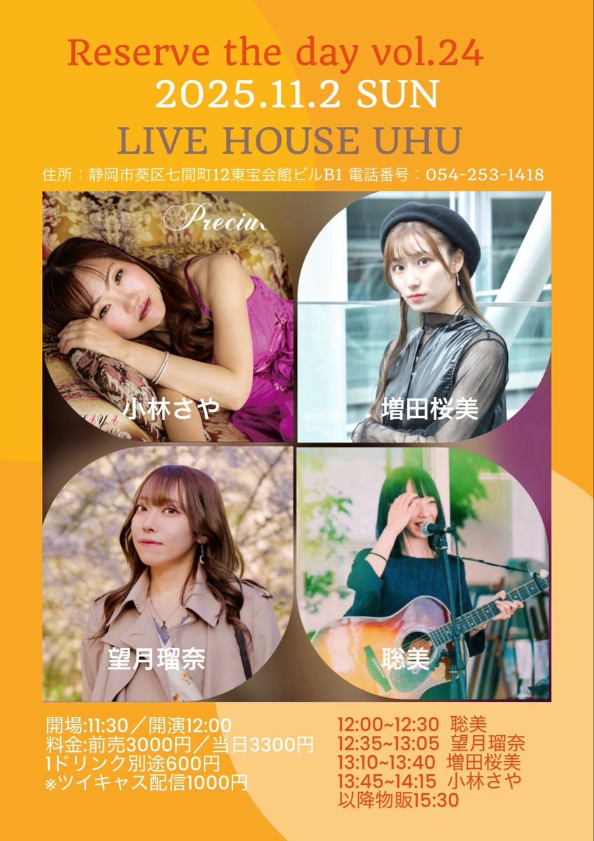 【ご予約お願いします🙏】 「Reserve the day vol.24」 開催日:2025年 11月 2日(日) 会場:ライブハウスUHU 住所:静岡市葵区七間町12東宝会館ビルB1 電話番号:054-253-1418 開場:11:30/開演12:00 料金:前売3000円/当日3300円 1ドリンク別途600円 ※ツイキャス配信1000円