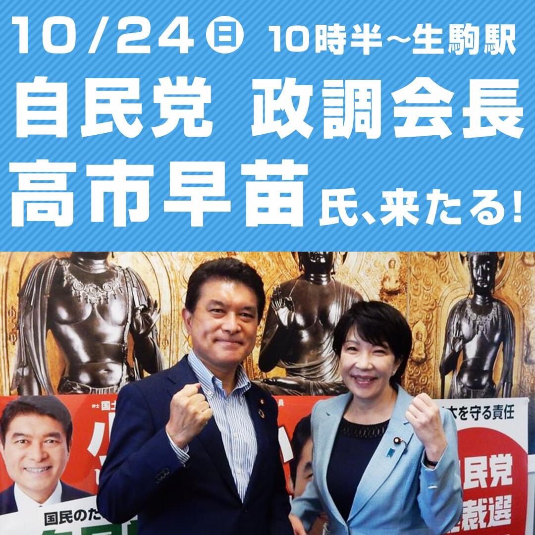 明日24日、候補者応援のため全国を飛び回っておられる高市早苗政調会長が、小林しげき候補の応援に奈良に戻って来られます。ご都合のつく方は、是非お越しください。 #高市早苗 #小林しげき #奈良1区 #自民党 #第49回衆議院議員総選挙 #2021衆院選 pic.x.com/jlnX6y6C4t