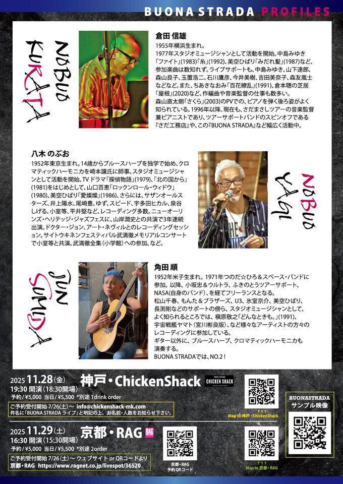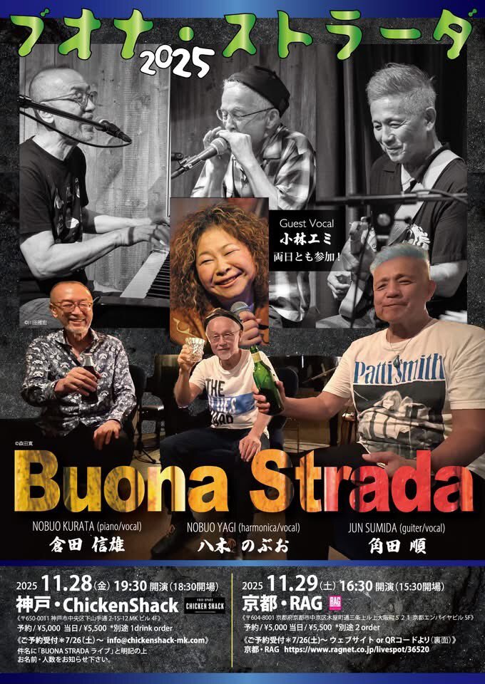 BUONA STRADA ライブのお知らせ(来週) 今年は本当にたくさんの素敵な方々と出会えた一年でした 来週のライブには、小林エミちゃんをゲストに迎えて、 いつも以上に楽しさあふれるステージをお届けします ぜひ気軽に遊びにいらしてください。 #BUONASTRADA #倉田信雄 #八木のぶお #角田順 #小林エミ pic.x.com/LMrmASCeSB
