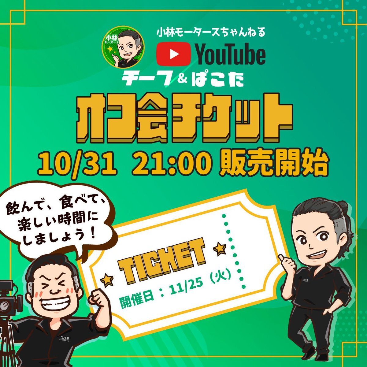 🎫本日21:00〜 オフ会チケット発売開始! 小林モータースちゃんねる初のオフ会開催します✨ 📅11/25(火)夜/都内・上野周辺🍻 誰が来てくれるのか…僕らもめっちゃ楽しみです! ぜひ一緒に飲んで、語って、笑いましょう😎 購入はこちら👇 🛒 kobamo.base.shop/items/123272721 #オフ会 #小林モータース pic.x.com/8HfWOW51EW