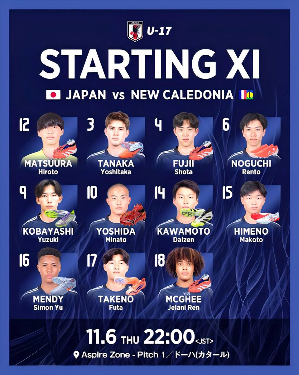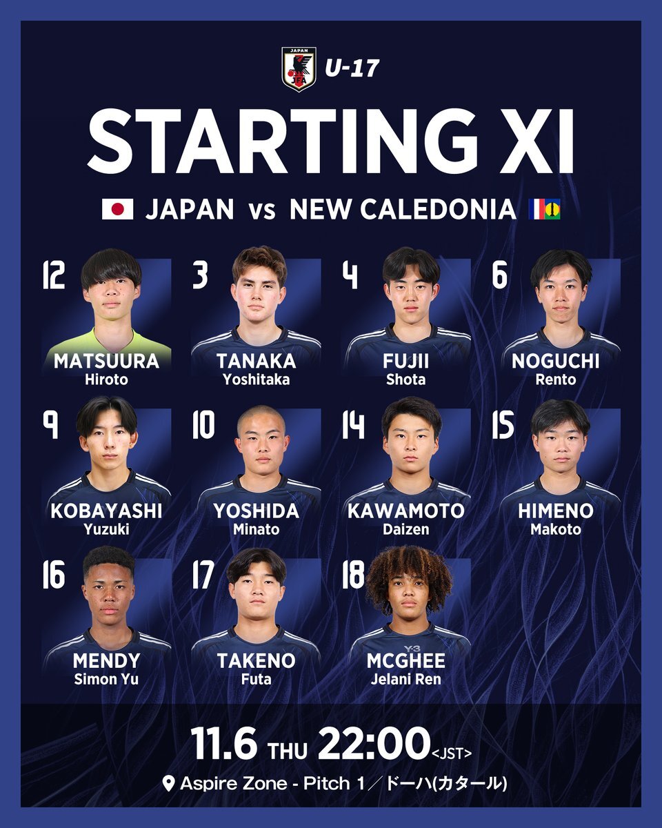 🏆FIFA U-17ワールドカップ カタール2025 グループリーグ第2節 #ニューカレドニア vs #日本 🇯🇵日本代表スタメン 12 #松浦大翔(GK)(C) 3 #田中義峯 4 #藤井翔大 6 #野口蓮斗 9 #小林柚希 10 #吉田湊海 14 #川本大善 15 #姫野誠 16 #メンディーサイモン友 17 #竹野楓太 18 #マギージェラニー蓮