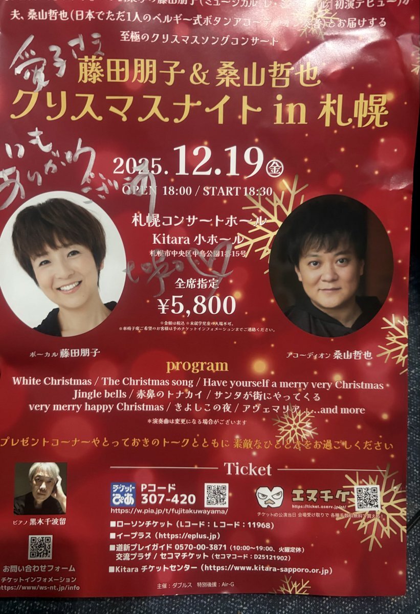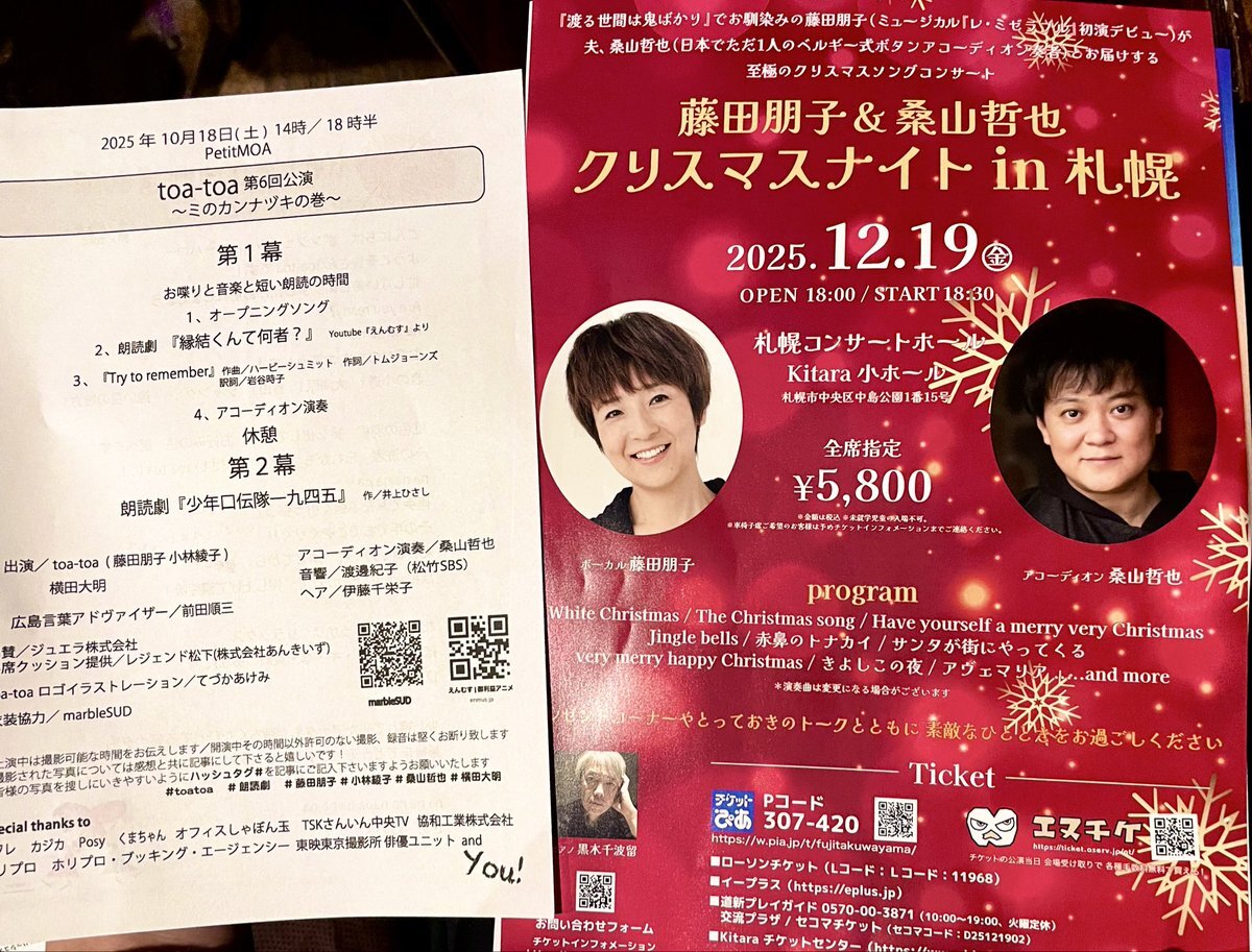 toa-toa 第6回公演 〜ミのカンナヅキの巻〜 間もなく開演!! ドキドキしちゃう、、、 クリスマスナイト in 札幌のチラシも! うれしい⛄️❄️☃️ #toatoa #朗読劇 #藤田朋子 #小林綾子 #桑山哲也 #横田大明 pic.x.com/vDM9wMZIp0
