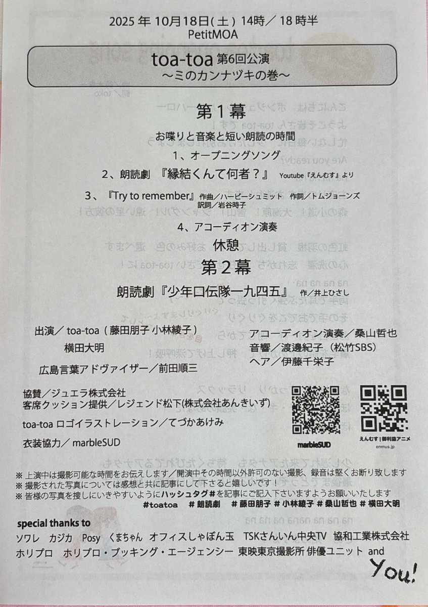 toa-toa 第6回公演 〜ミのカンナヅキの巻〜 歌と朗読とアコーディオンと朗読と、楽しいおしゃべり 井上ひさしさんの「少年口伝隊一九四五」は胸を締め付けられました 素晴らしい夜でした ぜひ桑山さんの故郷・札幌でもやってほしい! #toatoa #朗読劇 #藤田朋子 #小林綾子 #桑山哲也 #横田大明 pic.x.com/2A1RkAPNjy