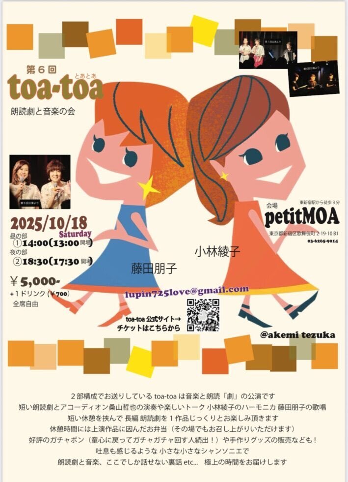 toa-toa 朗読劇ライブ 第6回 in PetitMOA 2025.10.18 小林綾子ちゃん&藤田朋子ちゃんのユニット「toa-toa」ライブに伺いました🎶 ゲストに俳優の横田大明さん😊朗読と歌!流石いい声👍 演奏は勿論、桑山哲也さん👍 楽しいかった〜😆 #toatoa #藤田朋子 #小林綾子 #横田大明 #桑山哲也 #PetitMOA
