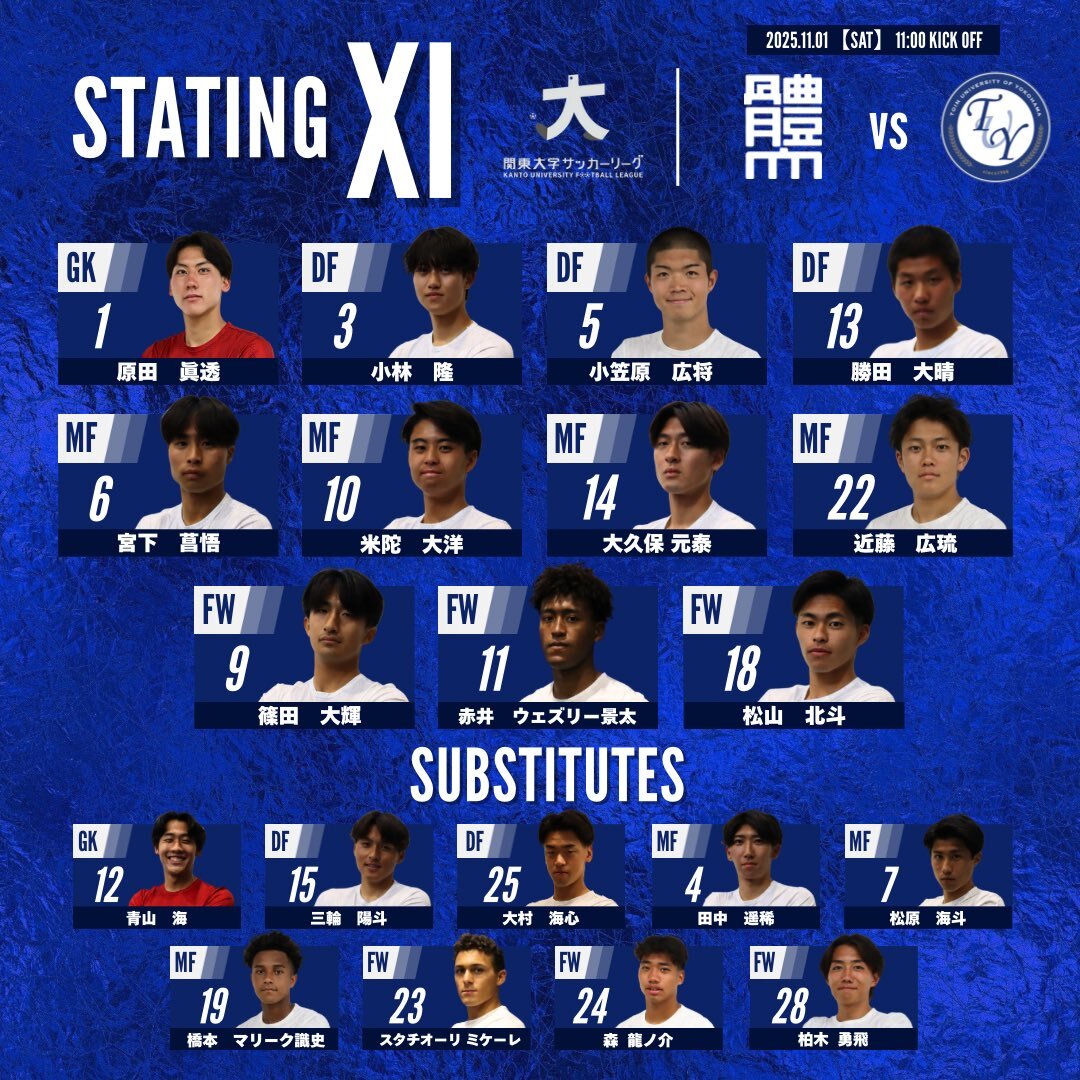 🔹メンバー発表🔹 関東リーグ 第18節 vs国士舘大学 【𝐒𝐓𝐀𝐑𝐓𝐈𝐍𝐆 𝐗𝐈】 #原田眞透 #小林隆 #小笠原広将 #勝田大晴 #宮下菖悟 #米陀大洋 #松山北斗 #橋本マリーク識史 #田中遥稀 #篠田大輝 #赤井ウェズリー景太 応援よろしくお願いします🦁💙 #日本体育大学 #関東大学サッカーリーグ