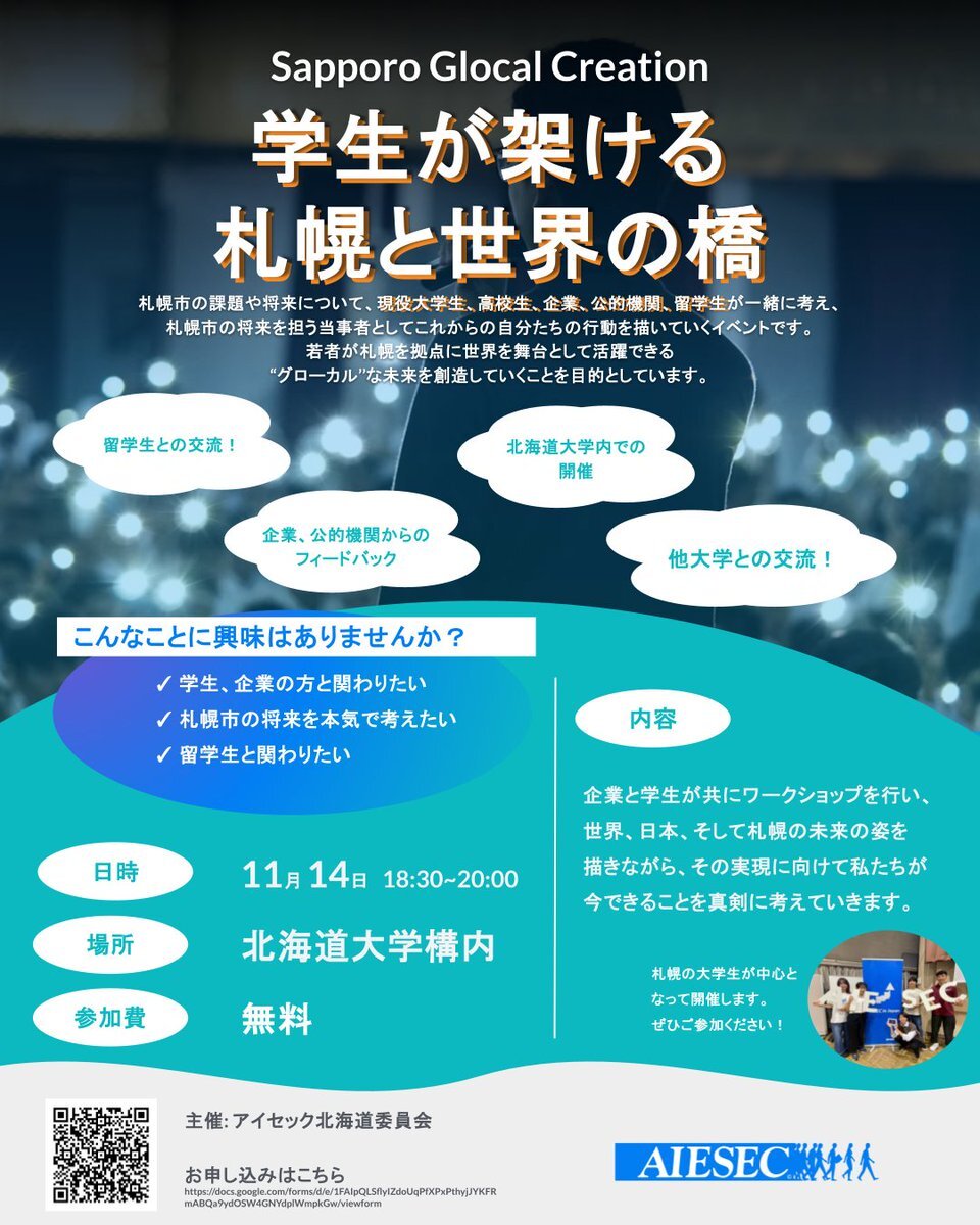 【イベント告知】 世界最大級の学生団体発 産学官民"外"、様々なバックグラウンドを持つみなさんが、札幌の未来を創造する 11月14日(金)18:30~20:00 ご質問はDMまで! お申し込みは、QRコード or プロフィール欄から #札幌 #北海道大学 #北海学園大学 #小樽商科大学 #アントレプレナーシップ pic.x.com/CBp7EQ1Jm5