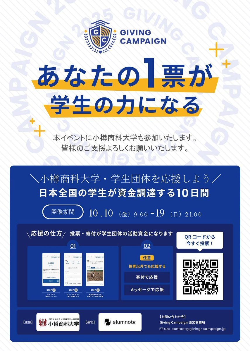 🎓【#GivingCampaign 2025 開催中】🎓 全国110大学が参加する学生チャリティーイベントに、小樽商科大学からも35団体が参加します! 本イベントでは、学生の活動を「投票(無料)」や「寄付」により応援できます。 ぜひ学生の挑戦を応援してください! 🗓️10/10 9時〜10/19 21時 #小樽商科大学 #OUC pic.x.com/IMlJkZbG6E
