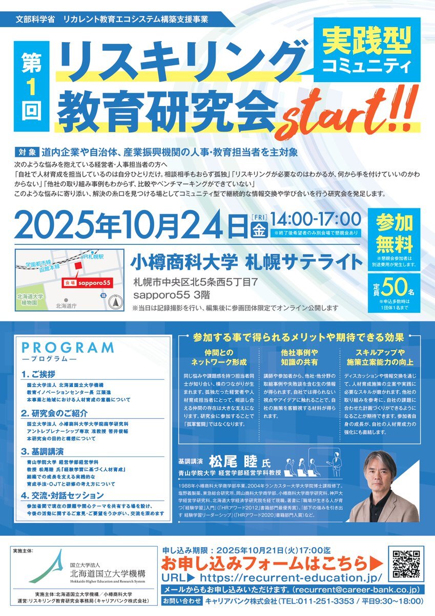 「第1回リスキリング教育研究会」開催のご案内🔔 道内の中小企業や自治体の人材育成担当者を 主な対象として、#リスキング 施策の高度化や 効果向上を目指します💡 ✅日時:10月24日(金)14:00~17:00 ✅場所:#小樽商科大学 札幌サテライト ✅主催:#北海道国立大学機構 kitami-it.ac.jp/topics/91616/ pic.x.com/MN8Foe7cHS