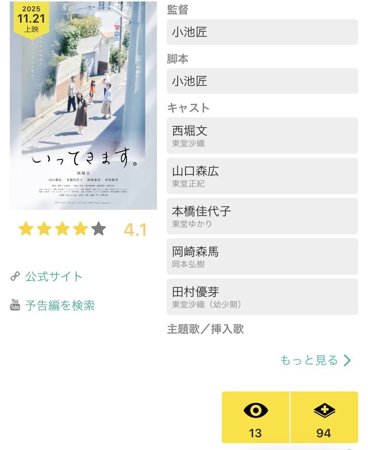 11月21日(金)公開! 映画「いってきます。」 Filmarksでのclip数がもう少しで100です! 公開まで残り20日ほどで1000近く、いやもっと多くclipしてもらえたらと思います!! 是非皆さまチェックしてくださいませ! filmarks.com/movies/122693 #映画いってきます。 x.com/koiketa93/stat…