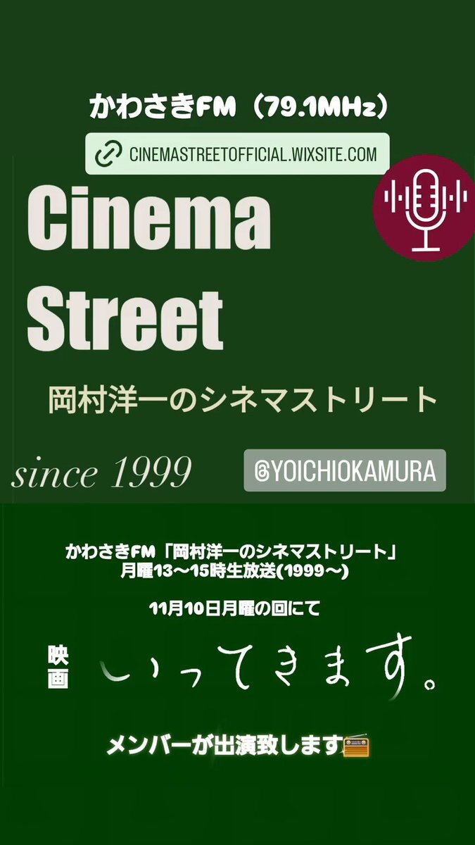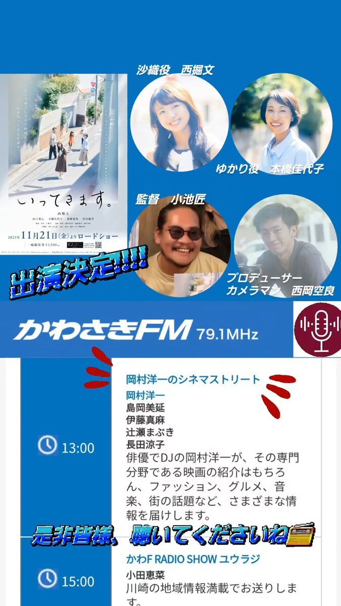 🚨緊急告知🚨 映画『いってきます。』が かわさきFM「岡村洋一のシネマストリート」月曜13~15時生放送(1999~)@CinemaStreet_ で特集されます📻 🔘11月10日(月)🔘 📻13:00~15:00 生放送OA📻 是非、聴いてみてね‼️ #ぶんちゃん #渋谷のラジオ #映画いってきます。 #西掘文 #小池匠 #西岡空良 pic.x.com/AV2mJ2sbfB