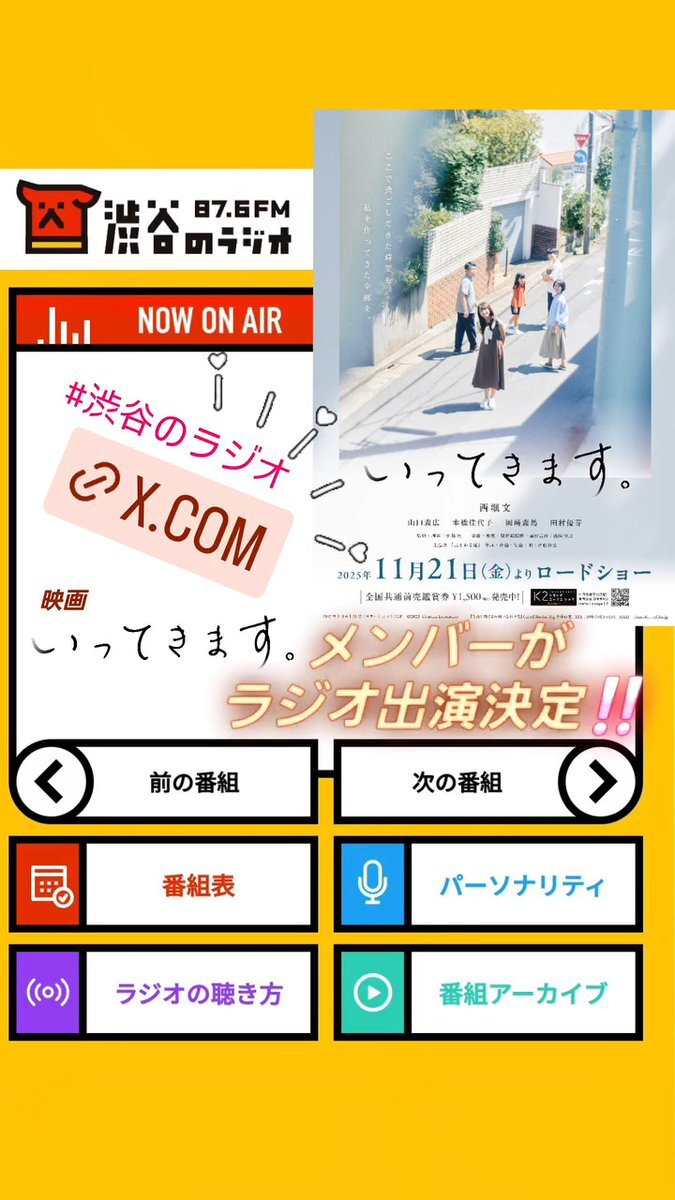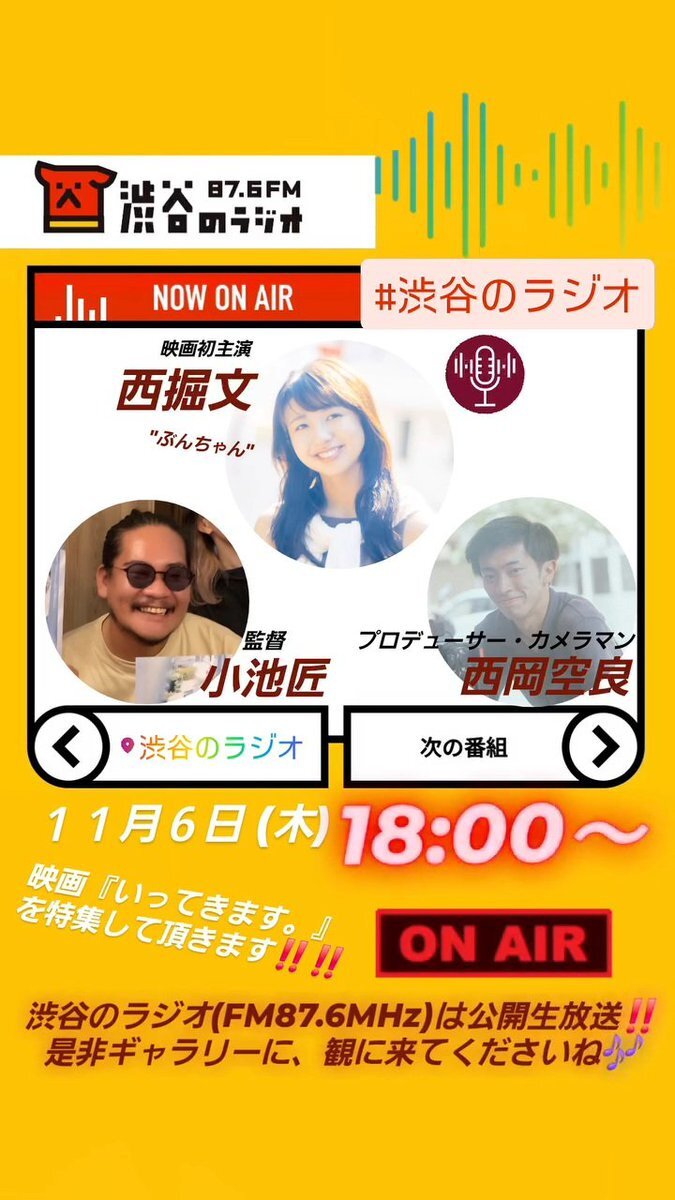 🚨緊急告知🚨 映画『いってきます。』が渋谷のラジオ @shibuyanoradio で特集されます📻 🔘11月6日(木)🔘 📻18:00~OA📻 渋谷のラジオ(FM87.6MHz)は公開生放送‼️ 是非スタジオを覗きに来てくださいね🎙️ #ぶんちゃん #渋谷のラジオ #映画いってきます。 #西掘文 #小池匠 #西岡空良 pic.x.com/vCDZV5i55p
