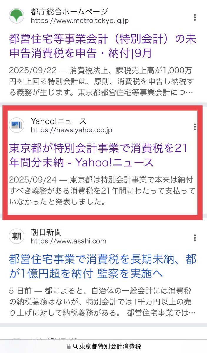 なんかね、 消されているのよYahoo!ニュースから🙄 他は表示されるんだけどね なぜかYahoo!だけ消えている🙄 #東京都 #消費税未納 #Yahooニュース