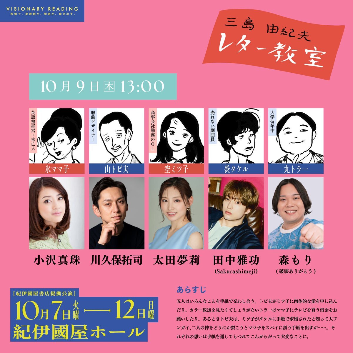 ┏ ━━┅━━━┅━━ ┓ #三島由紀夫レター教室 10/09(木)13:00公演📚 ┗ ━━┅━━━┅━━ ┛ キャスト🕺 #小沢真珠 #川久保拓司 #太田夢莉 #田中雅功 #森もり ロビー開場🚪 開演の45分前 客席開場💺 開演の30分前 当日券🎟️ ご用意あります☑️ 🔗公式HP aoi-stage.jp/mishima_letter/ x.com/mishima_letter…