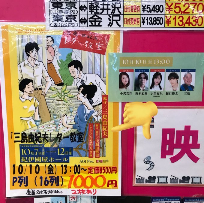 10/10(金)13:00~ #紀伊国屋ホール#三島由紀夫レター教室」 全席指定 P列 定価8500円→なんとっ✨1枚1000円❣️✨ 2枚あり(連番ではありません) 当日のみお取り置きできますヨ ☎️03-5360-6821 #小沢真珠 #新木宏典 #小栗有以  #樋口有太 #三瓶 #津田健次郎 (案内人) pic.x.com/Q2YX7TFdOh