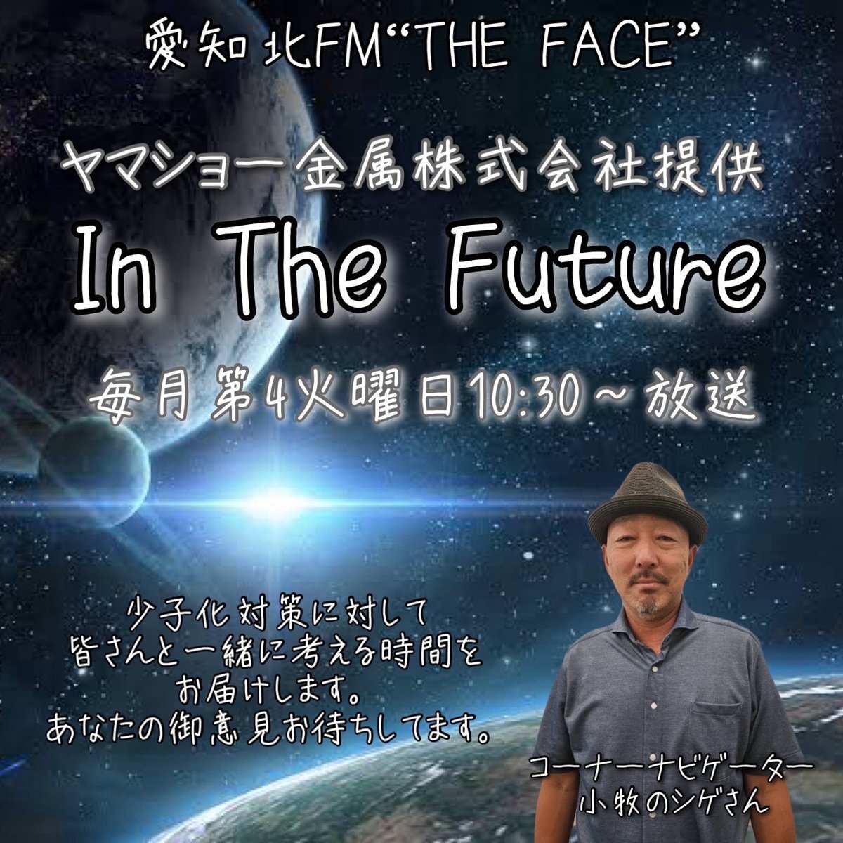 愛知北FM 84.2HMz「THE FACE」 毎週火曜〜木曜 9:00~11:00生放送 毎月第4火曜10:30〜 #ヤマショー金属株式会社 提供 HP is.gd/jOfAxF #小牧のシゲさん ナビゲート “ In The Future ”をON AIR #UNザフェイス #インザフューチャー842 #少子化対策 #再生医療 #小牧 pic.x.com/uJj9XSNeNw