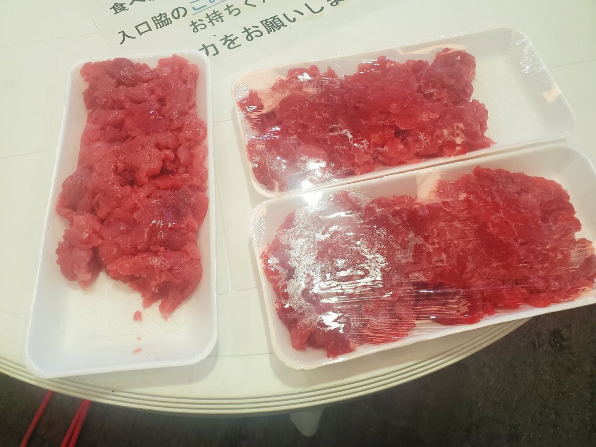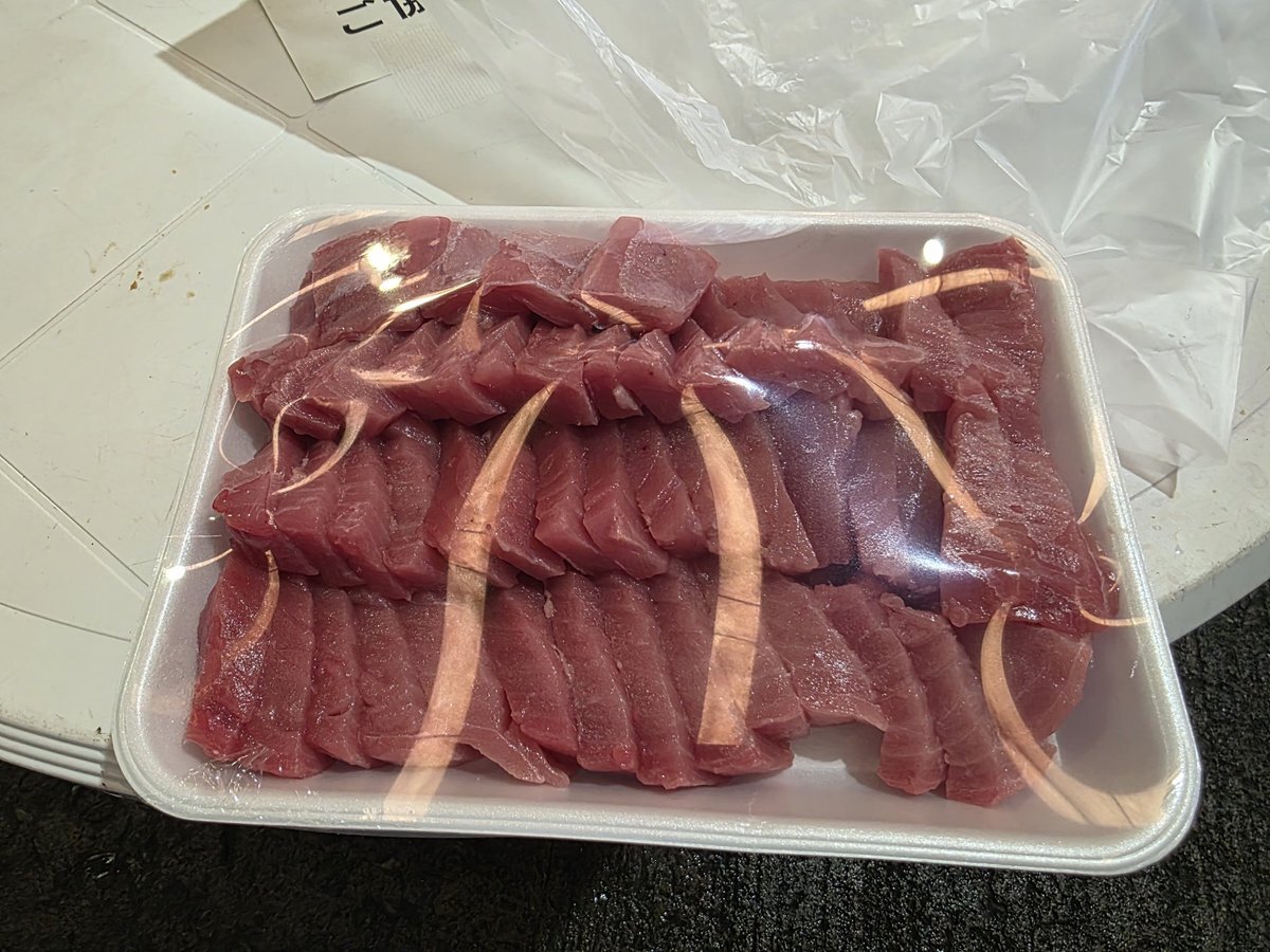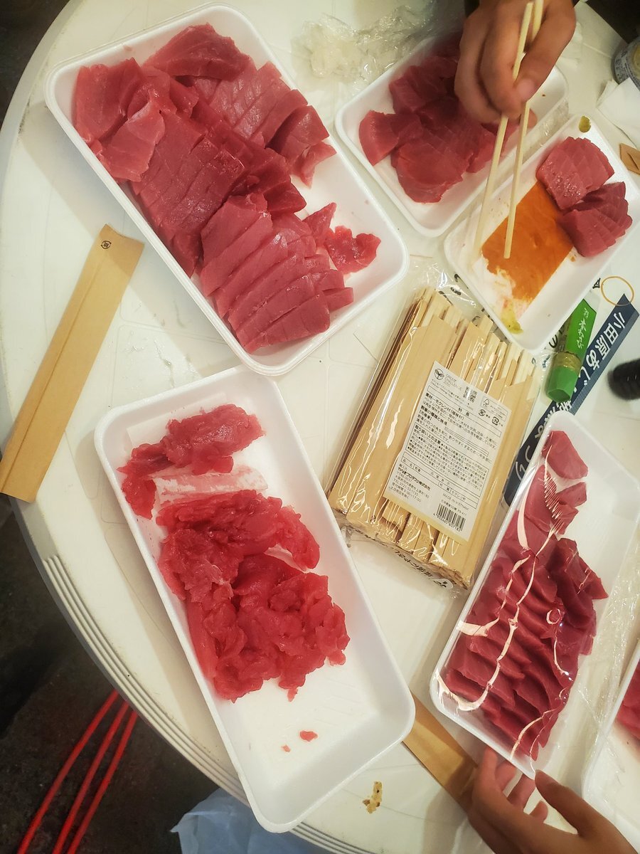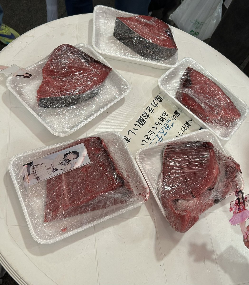 めいめいが刃を入れたマグロ🐟、セリじゃんけん大会で2500円でお持ち帰り。我が家の夕飯にします🍚😋 魚市場の方に塊を刺身してもらいました。 #小田原あじ・地魚まつり2025 #花田藍衣 #AKB48 pic.x.com/QeJgROORkI