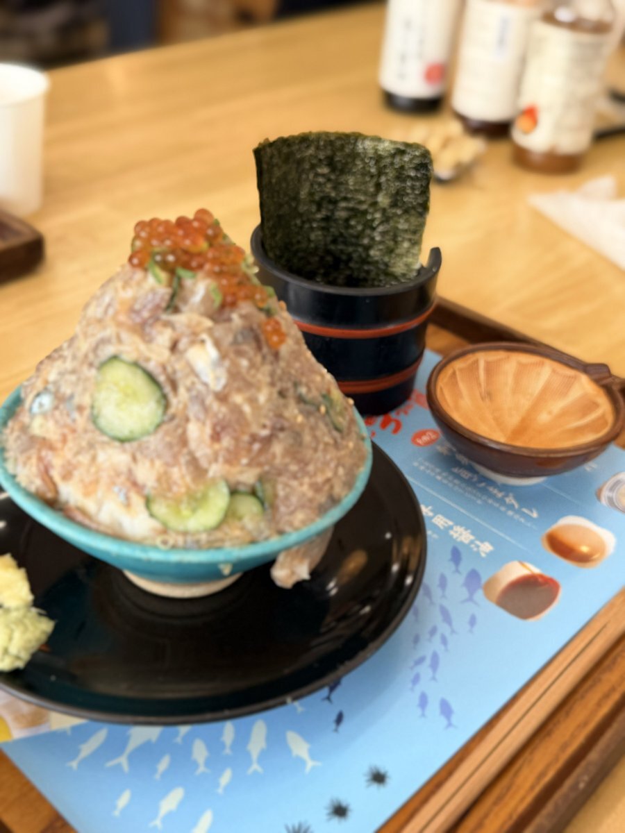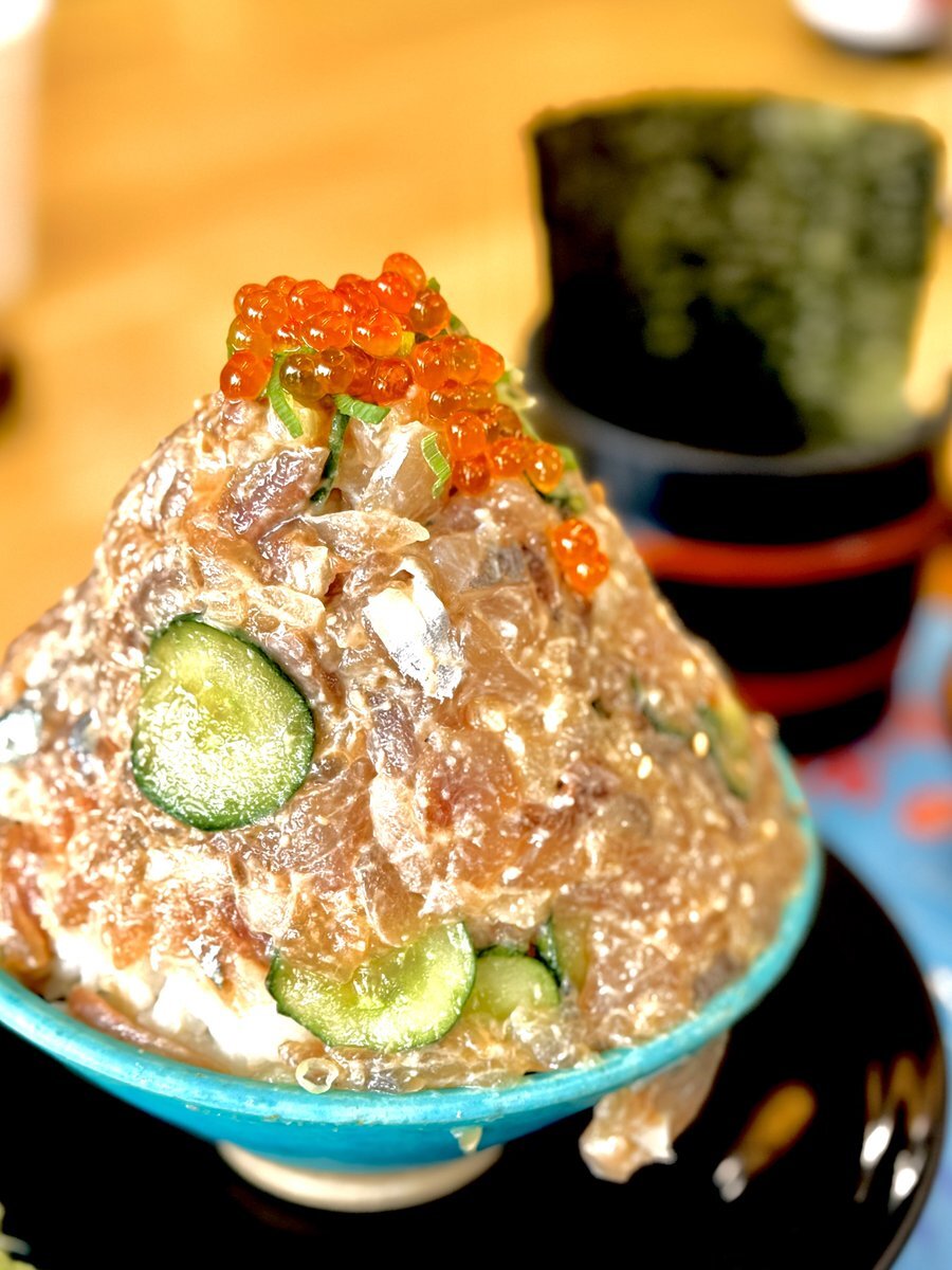 【小田原漁港とと丸食堂】で『なめろう頂上丼』をオーダー!1,070円でビジュアル最高✨ ご飯が積まれてその周りになめろうがたっぷり!最後はお出汁があるので、お茶漬け風にいただくのもおすすめ。このお出汁も最高です! #小田原漁港 #とと丸食堂 #なめろう頂上丼 #海鮮丼 #お茶漬け #小田原グルメ pic.x.com/Gvrq4qRo0z