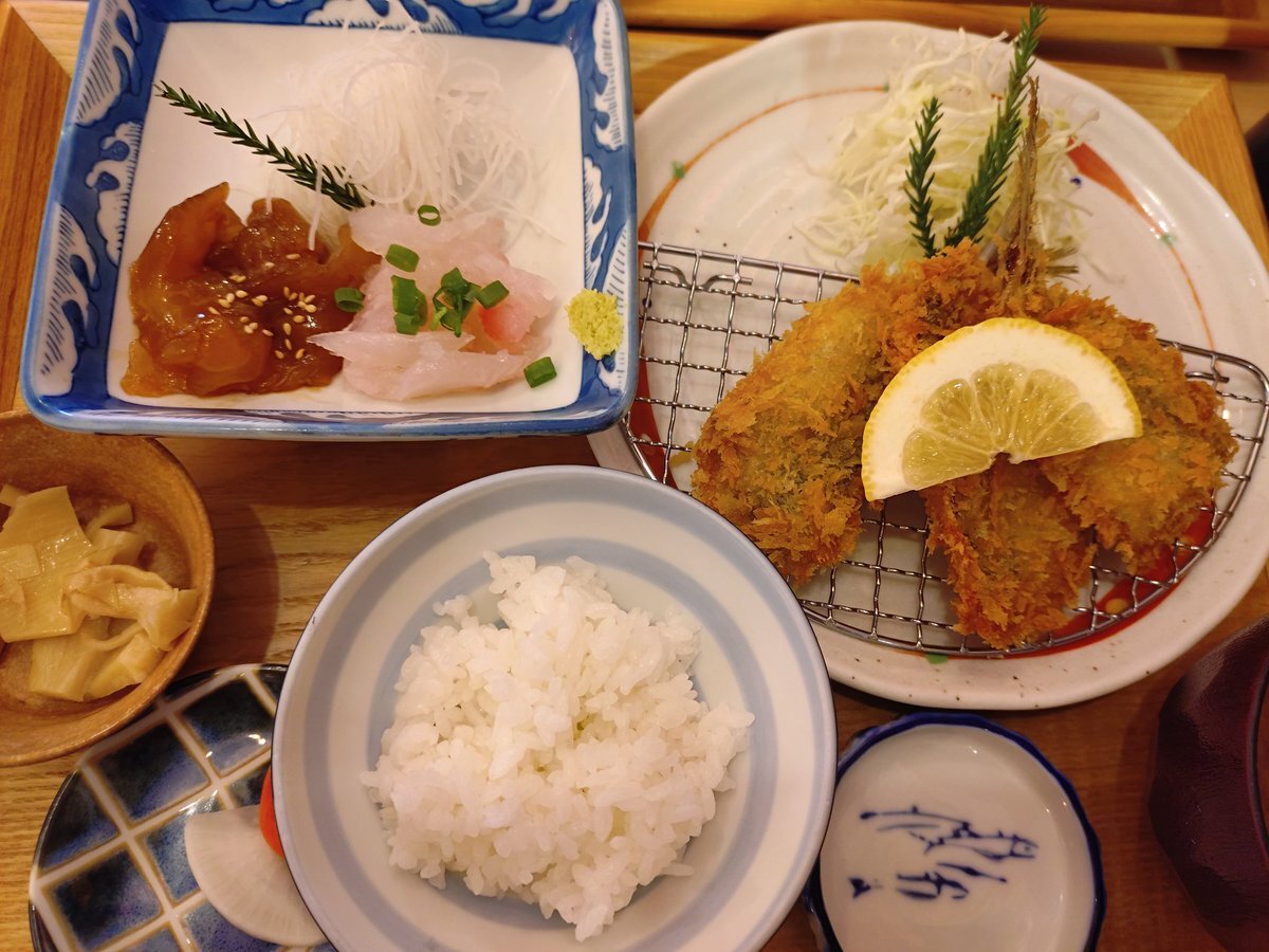 アジフライと 刺身二種定食 おきめじなとエソ 地魚でしょうか? エソという名前初めて知りました 蒲鉾の材料になったりするよう #小田原漁港 pic.x.com/Hm7NqGGKJu