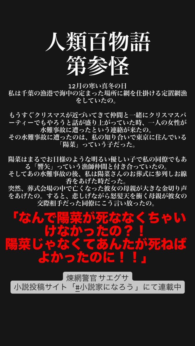 #人類百物語 第参怪「交際者に狂言する母親」 小説「煉網警官 サエグサ」 第1話から最新話まで無料公開中です! ぜひご覧ください! 『#小説家になろう』にて連載中!⬇️ ncode.syosetu.com/n2898kz/ #アマチュア #小説家 #執筆 #活動 #拡散希望 #拡散 #人類百物語 #オリジナル小説 pic.x.com/0bL8WZMrJU