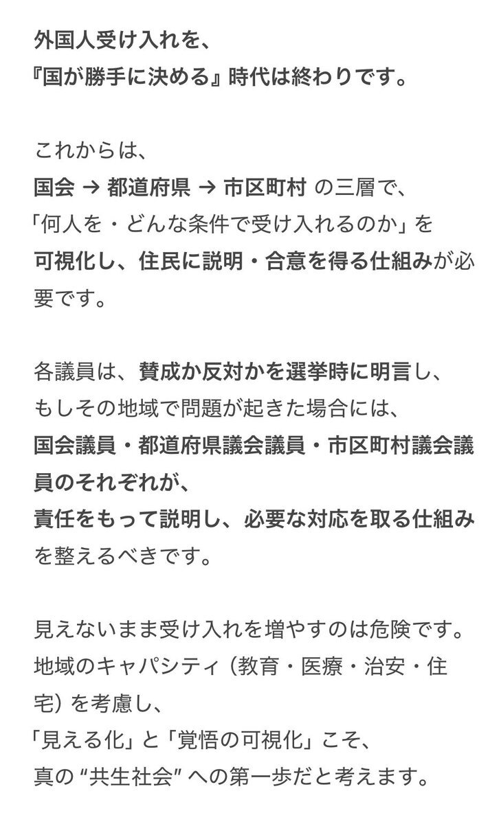 返信先:@hiro_jp0904#小野田さんに届け #提案 #外国人受け入れ #見える政治 外国人の受け入れに賛成する議員の皆さんには、責任をもって、自らが暮らす地域で受け入れる覚悟を示して頂きたいです。 地域の実情を理解し、住民と共に考え、その判断に責任を持つことこそ、本来の政治であり、議員の使命ではないでしょうか。 pic.x.com/ppsCObRjfD