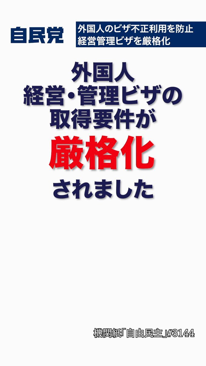 📹️外国人のビザ不正利用を防止 経営管理ビザを厳格化【LDP TOPICS】1分解説 移住を目的とし経営・管理ビザを悪用する外国人がいるという指摘等を踏まえ、自民党の外国人材等に関する特別委員会で議論を重ねた結果、今回の厳格化につながりました。 改正のポイントを紹介します。