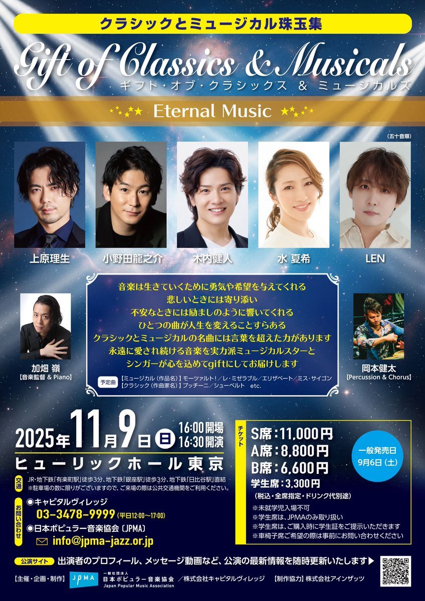 11月9日開催した Gift of Classic & Musical クラシックとミュージカル珠玉集 #上原理生✨#小野田龍之介✨#木内健人✨#水夏希✨ #LEN✨#加畑嶺✨#岡本健太 ご好評につきオンラインにてパンフレットを販売いたします💗 数量限定:20冊 2000円(税込)+ 700円送料別 📩 jpma-jazz.or.jp/shop/item.html pic.x.com/NB5bNrht2N