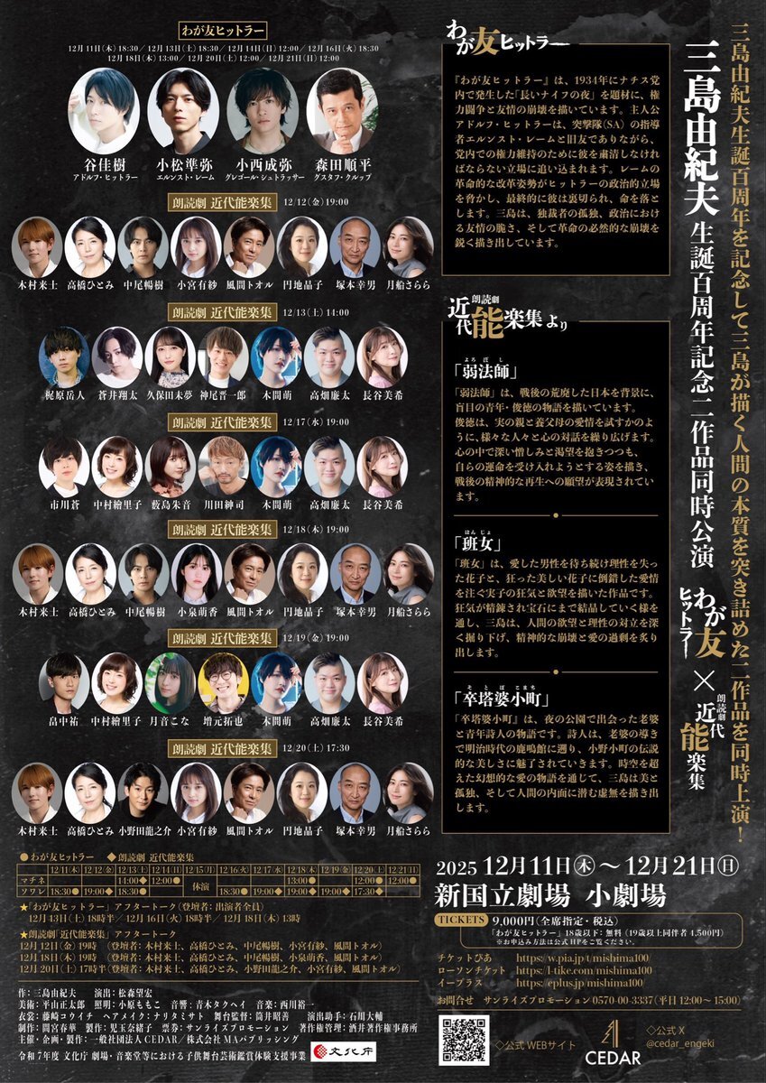📮出演情報📮 // 12月20日(土)17:30公演 朗読劇「近代能楽集」 「卒塔婆小町」詩人役 「班女」吉雄役 にて #小野田龍之介 出演決定! \\ 🎟️FC先行チケット販売(先着順)🎟️ 本日、11月7日(金)23:59まで 詳細はこちらから onodaland.com/contents/10014… ⚠️本日〆切ですので、ご注意ください! pic.x.com/EKAXHLAgFW x.com/cedar_engeki/s…