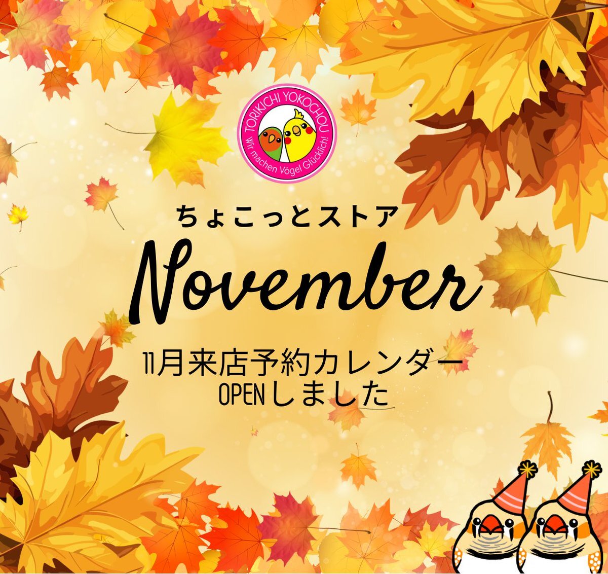 大阪・天満橋の小さな実店舗 ちょこっとストアからの お知らせです。 ちょこっとストア 金曜日の営業時間を増やしております。 11月の土曜日は2回OPENします😊 ご予約はこちらからお願い致します。 airrsv.net/tyokochou/cale…#とりきち横丁 #小鳥の世界を幸せにしたい #鳥好きさんと繋がりたい pic.x.com/sOztMwXsBv