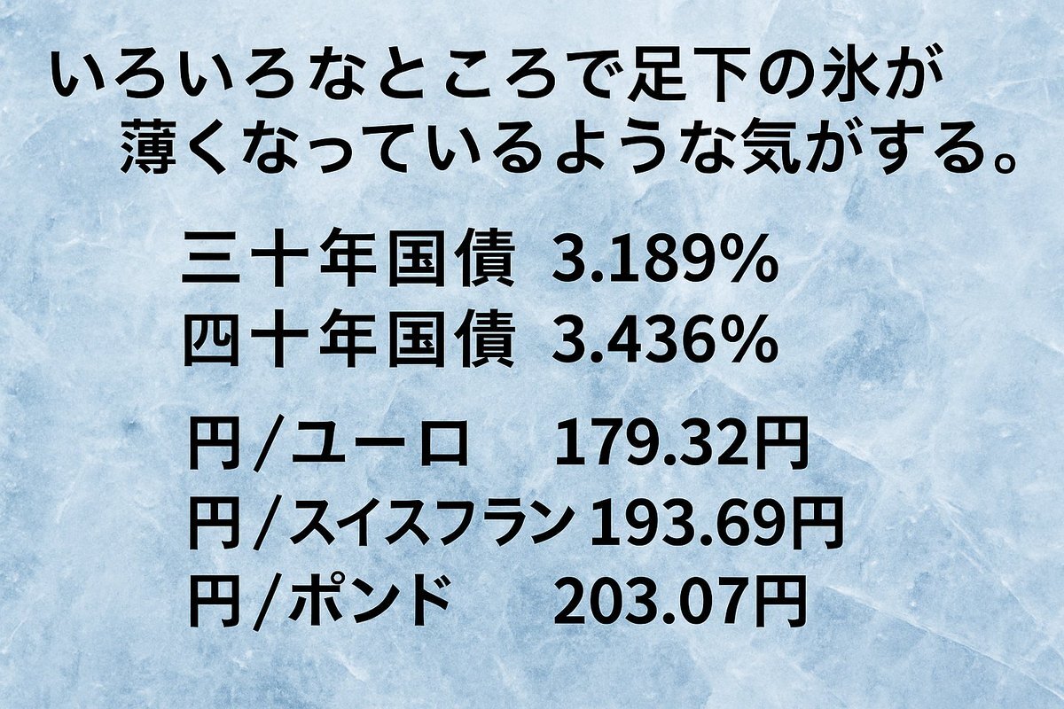 いろいろなところで足下の氷が 薄くなっているような気がする。 三十年国債 3.189% 四十年国債 3.436% 円/ユーロ 179.32円 円/スイスフラン193.69円 円/ポンド203.07円 #まずは知ることから #投資は怖いけど興味ある #将来資金 #毎月積み立て #少額投資 #株初心者 #投資初心者 pic.x.com/xNQbaZmO0J